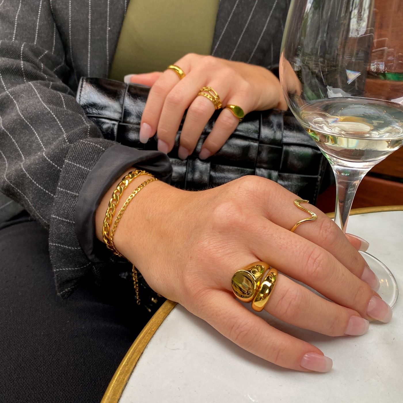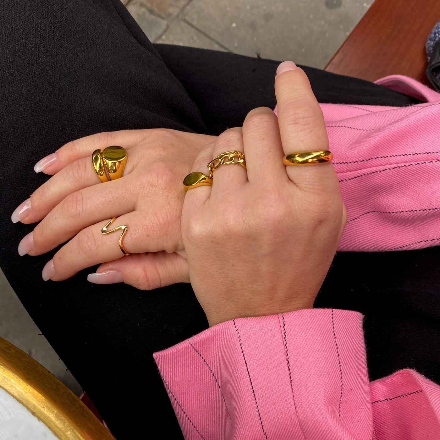 Materiale: Rustfrit Stål forgyldt med 18 karat guld. Smykkerne er nikkelfri og blyfri, jvf. dansk lovgivning. For at forlænge levetiden af dit smykke, anbefaler vi at du er forsigtig omkring hårde overflader.  Ringen måler 6mm høj.