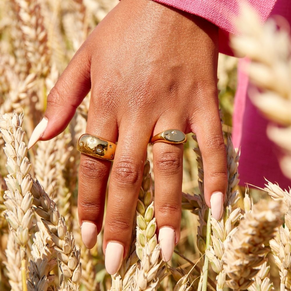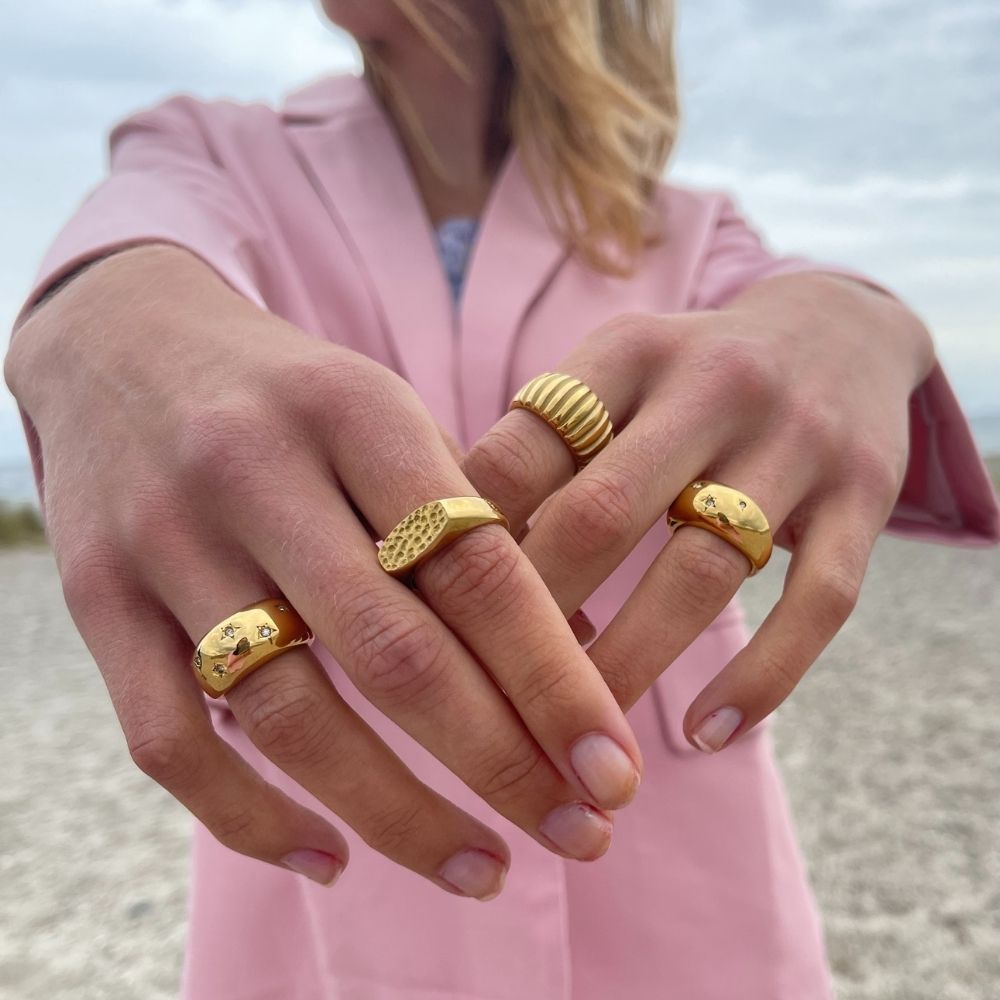Materiale: Rustfrit Stål forgyldt med 18 karat guld. Smykkerne er nikkelfri og blyfri, jvf. dansk lovgivning. For at forlænge levetiden af dit smykke, anbefaler vi at du er forsigtig omkring hårde overflader. Ringen måler 11mm høj.