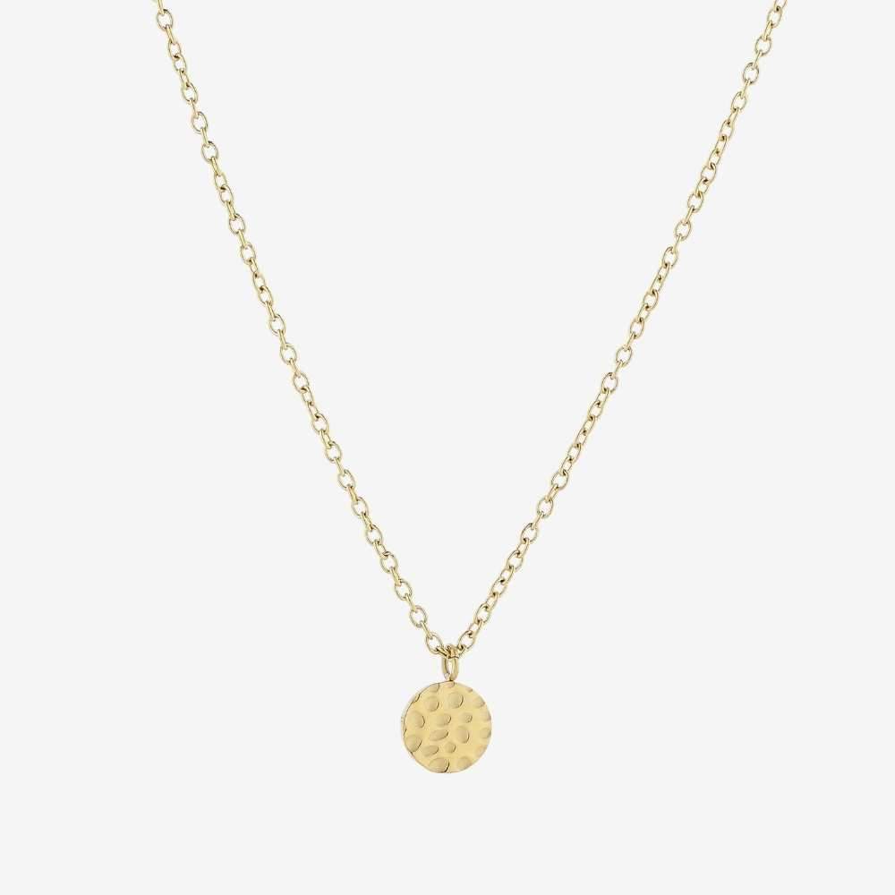 Materiale: Rustfrit Stål forgyldt med 18 karat guld. Smykkerne er nikkelfri og blyfri, jvf. dansk lovgivning. Måler 45cm + 5cm extender. Vedhæng måler 0,7cm i diameter. Vedhænget er hamret på begge sider.
