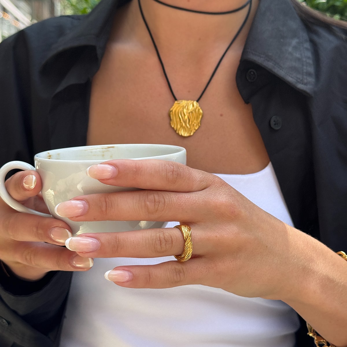 Statement-smykkerne i kollektionen inviterer dig til at tage plads. De er skulpturelle, men stadig organiske. De bevæger sig med kroppen og fanger lyset, ligesom vinden fanger alt i sin vej – let, men kraftfuldt.